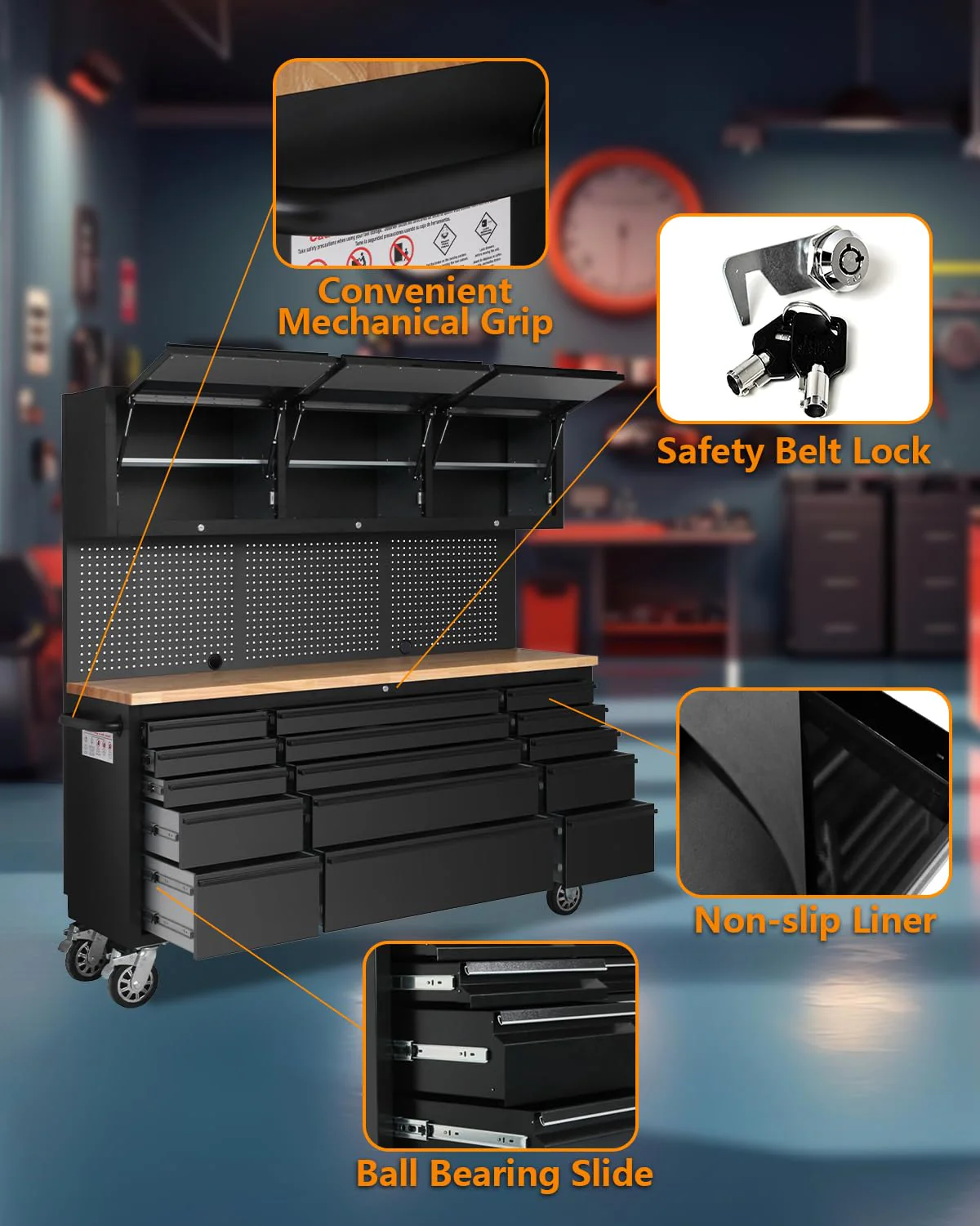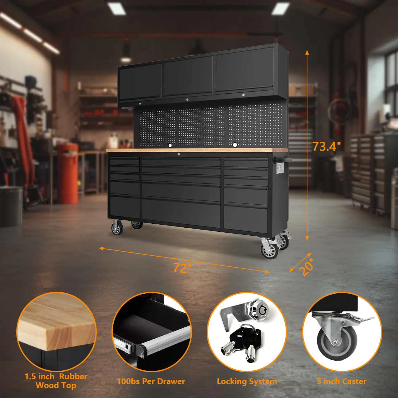 Garvee 15-Drawer Large Rolling Tool Chest, 72" x 20" Mobile Tool Storage Cabinet with 3 Up Top Cabinet & Pegboard, Wheels, Garage Tool Box Organizer with Anti-Slip Liner for Warehouse, Repair Shop