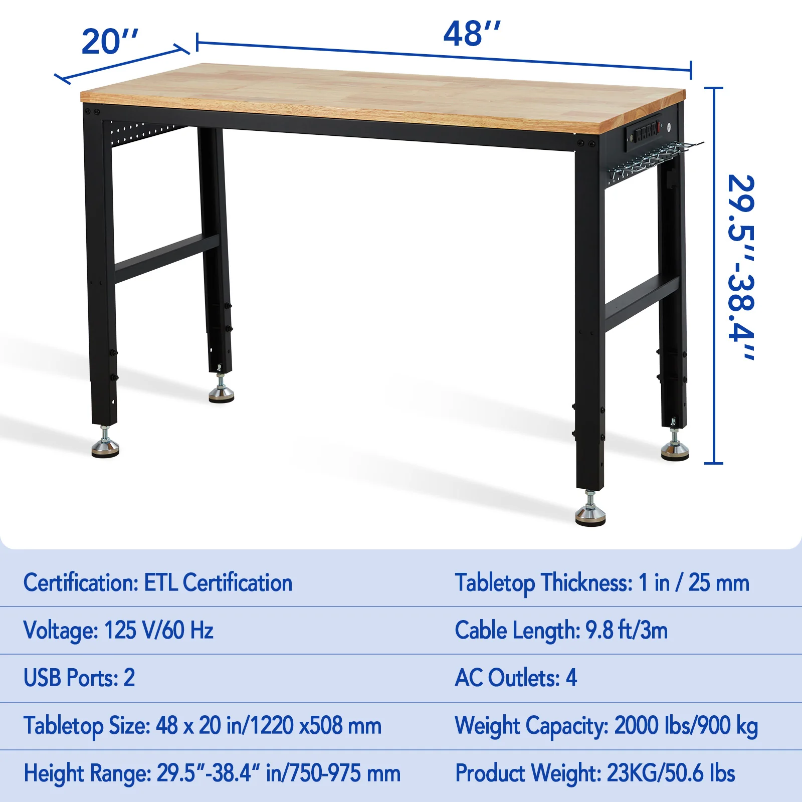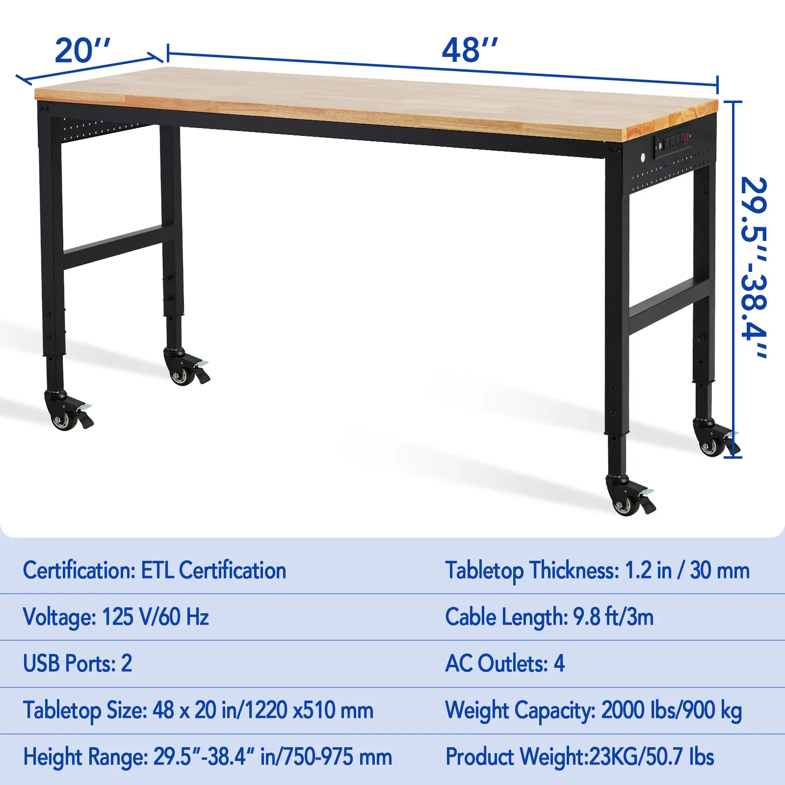 Garvee 48" x 20" Adjustable Height Workbench, Hardwood Heavy Duty Workstation, 2000 LBS Load Capacity Work Table with Power Outlets for Workshop Office Home Garage