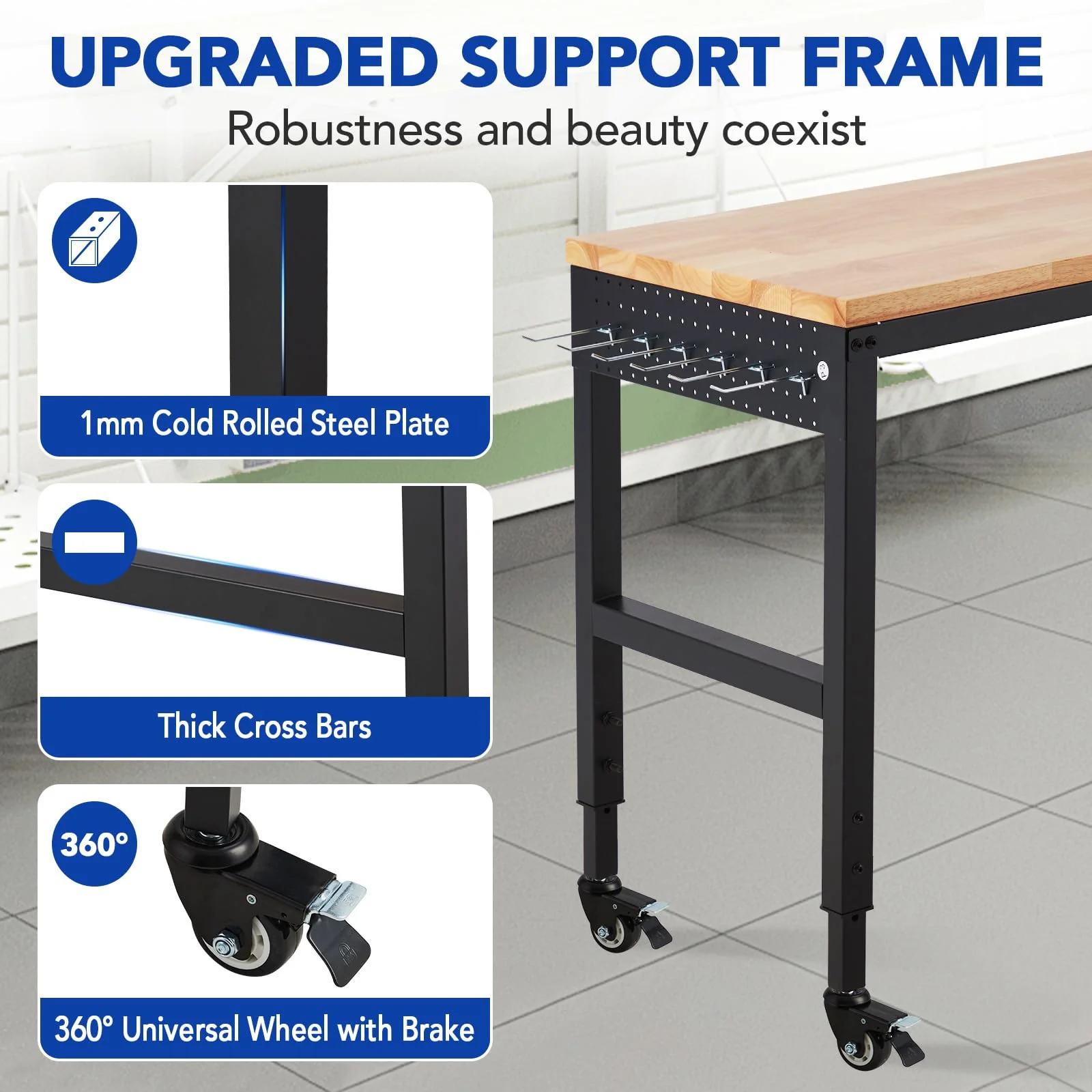 Garvee 72"x25" Adjustable Workbench, 2000 lbs Load Capacity, Height 29.5"-38.4", Solid Wood Top, Carbon Steel Legs, Power Outlet, Universal Wheels, Workshop Garage Home