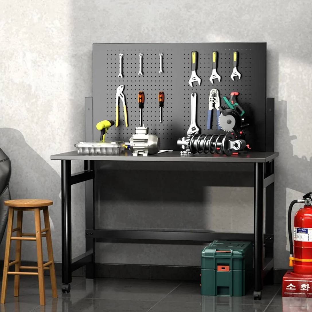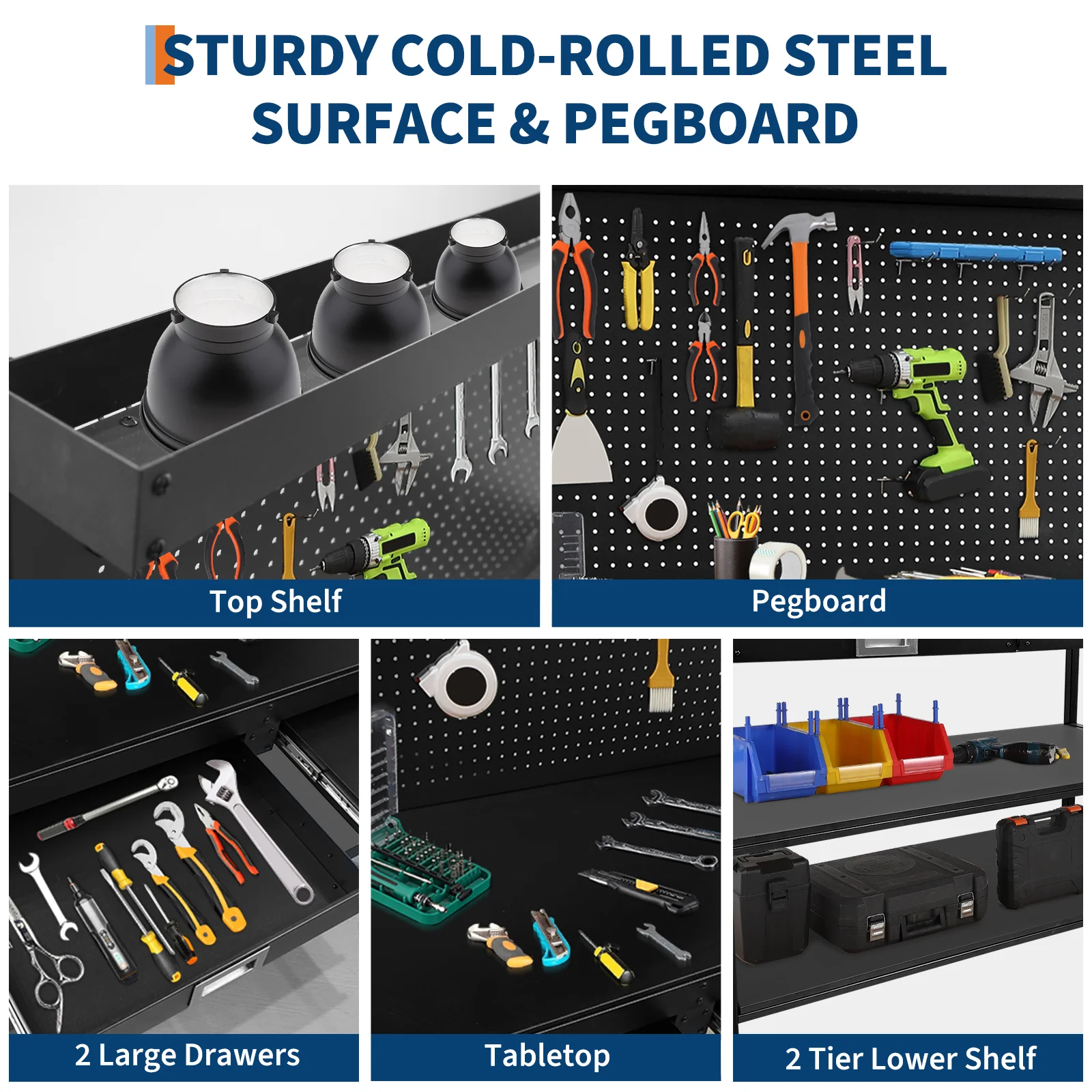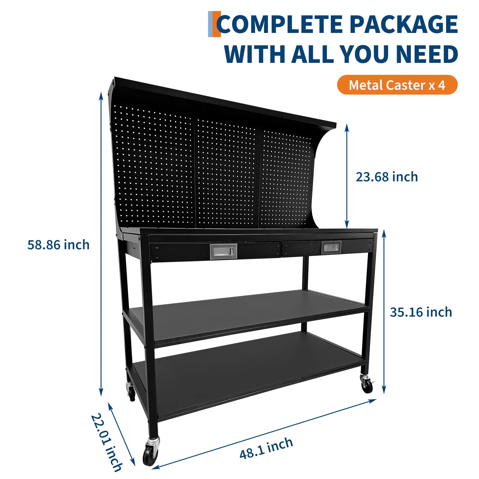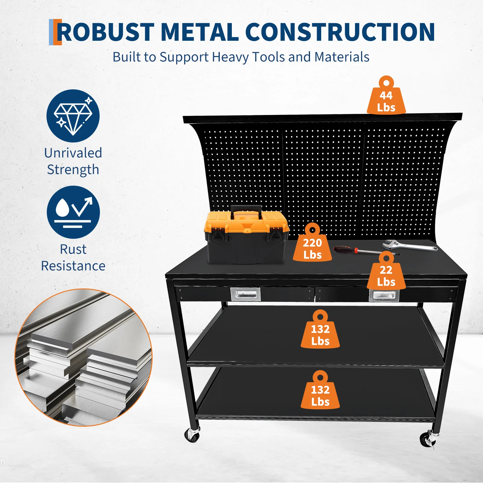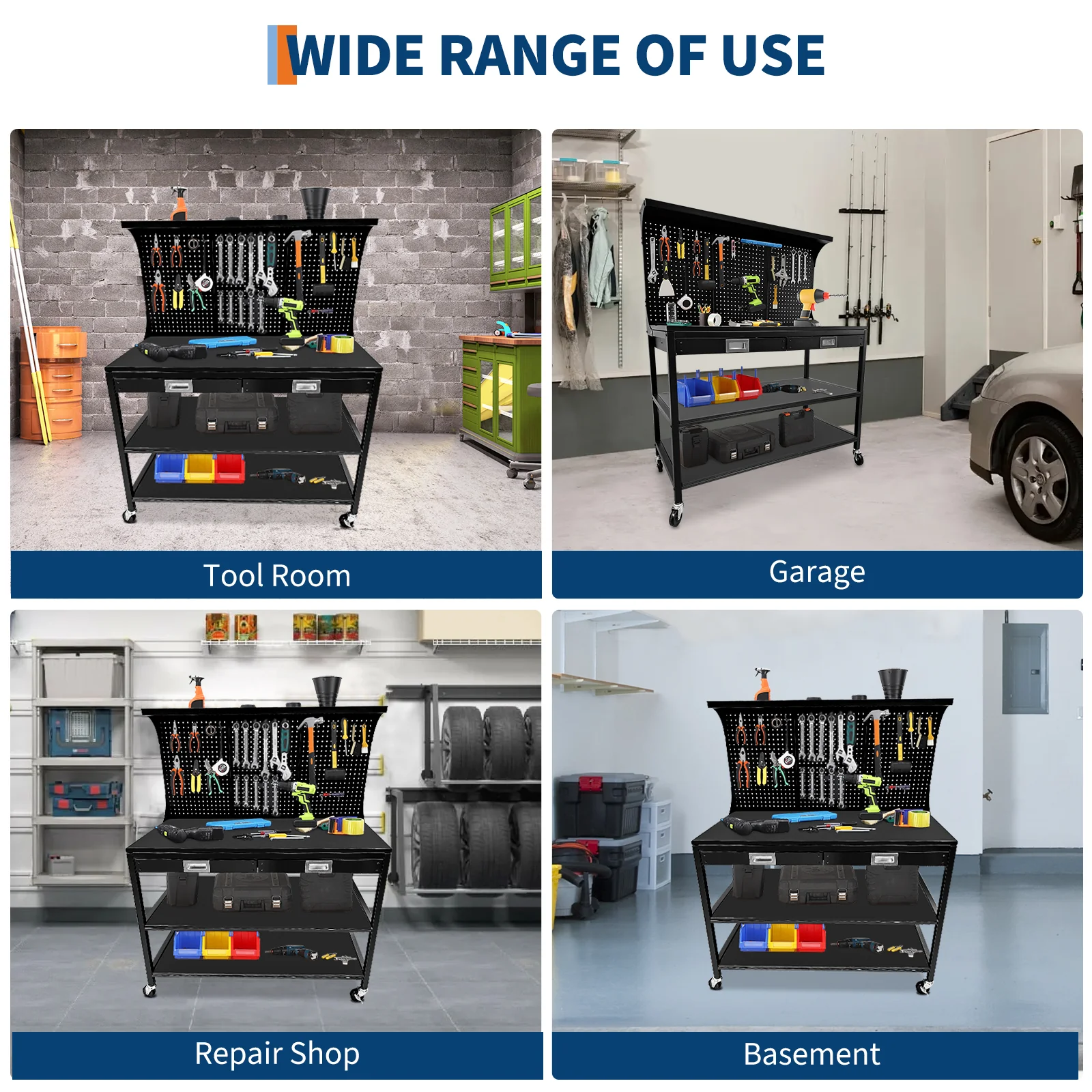 Garvee 48 Inch Workbench, Heavy Duty Steel Tool Workbench with 2 Drawers and 2 Storage Shelves, Multifunctional Work Table with Pegboard and Wheels for Garage, Workshop, Basement