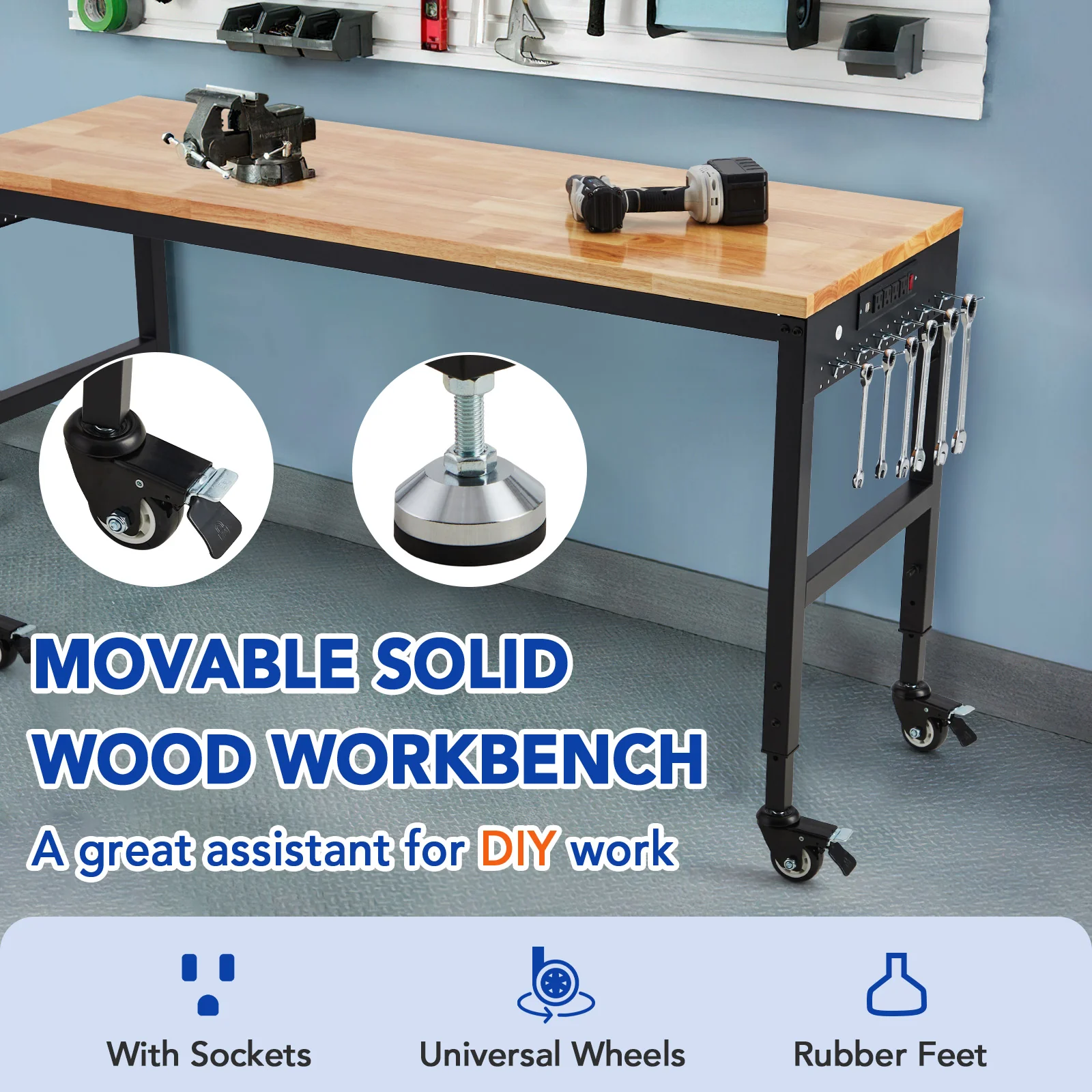 Garvee 60" x 22" Adjustable Workbench, Rubber Wood Top Work Table with Wheels, 2000 LBS Heavy Duty Work Benches with Power Outlets, Workstation for Garage Party Shop Office